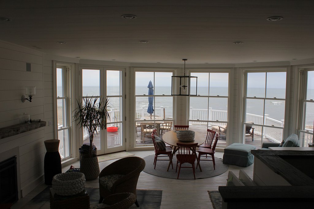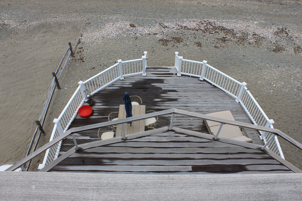 Complete renovation of this waterfront property on Long Island Sound included many unique challenges from a construction perspective. Building on the shore requires an extensive knowledge of proper building practices, FEMA regulations, zoning & building codes, as well as the appropriate materials to be used in order for the strcuture to stand up to the extreme environment. This property resides in the flood plain and is elevated on steel piers, however the original construction was poorly completed and much of the structure reflected the effects, including rot & water infiltration in most areas. The entire building was reworked including roof details, wall framing and sheathing. All the window openings were reworked and Marvin windows & doors were installed and finished with custom trim details inside & out that we manufactured. Custom triple hung windows were installed looking out toward the water from the family room on the first floor. To protect these windows motorized storm shutters and screens were installed yet hidden in the structural soffit above so as not to be noticed except when in use. The entire exterior of the house recieved new trim details & siding backed with a drainage matrix to endure the harsh waterfront environment. Many decks & balconies were constructed from Ipe decking and custom stainless steel cable rails were used on the beach side. The original front facade, entry, and accompanying stairwell were completely changed to include more pleasing asthetics & an elevator. All the cabinetry was custom manufactured in our shop along with many other details through out the house. The interior of the entire first floor was finished, walls & ceilings, with custom milled, random width, poplar shiplap to create the feeling of a beach cottage yet with contemporary design elements. There are far to many details to list here but many are displayed in the pictures above. This project allowed us many opportunities to display our custom craftsmanship and it was truly a pleasure to work not only on the house itself but alongside the homeowner who had an incredible vision of the end product.